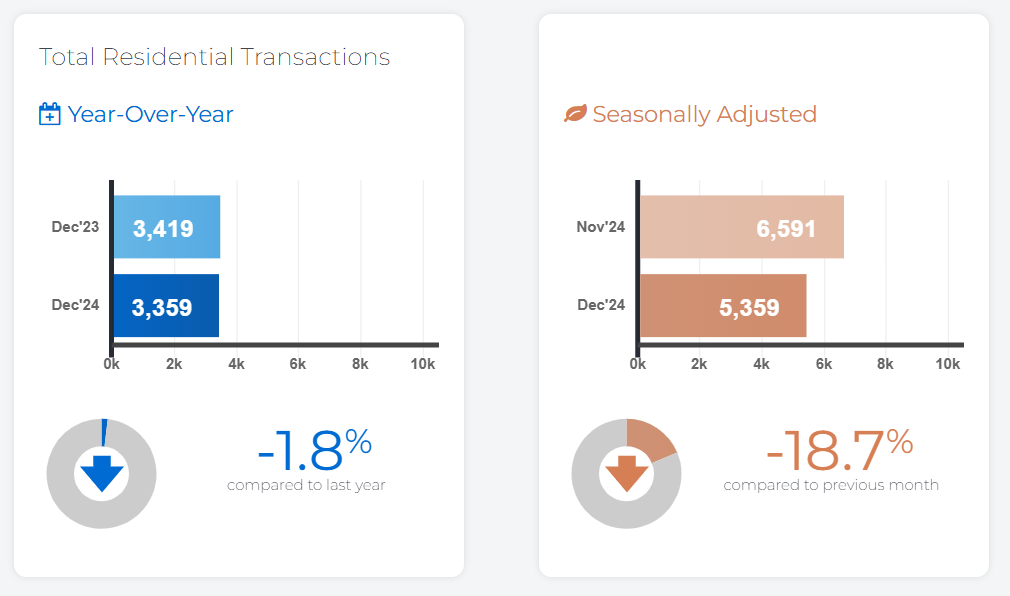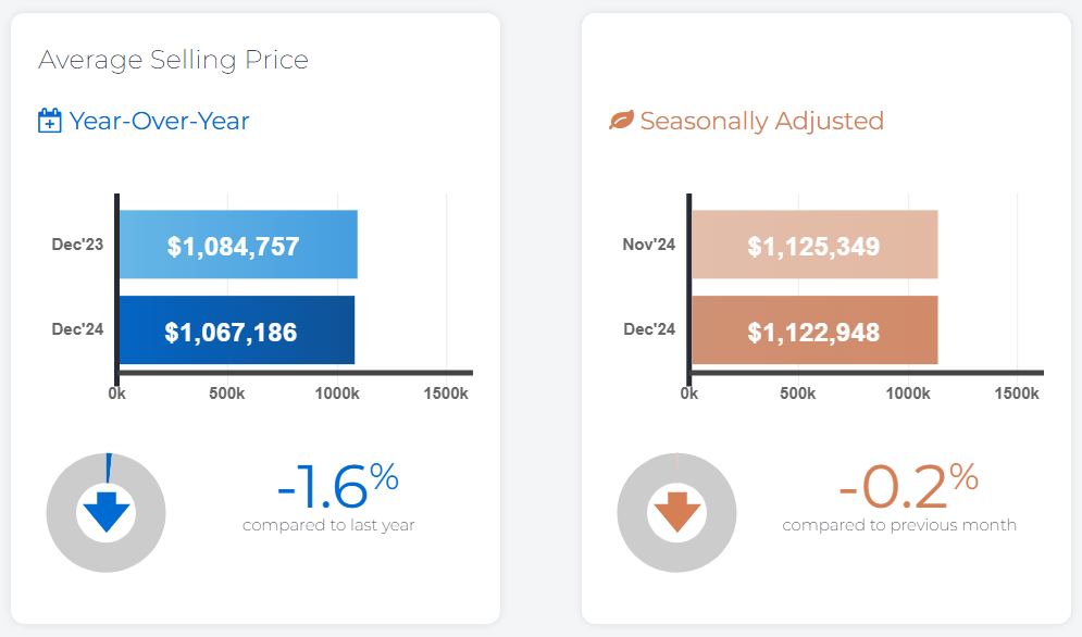 GTA home sales amounted to 3,359 in December 2024 – down slightly from December 2023. New listings were up over the same period, continuing the trend of a well-supplied market. The MLS® Home Price Index Composite Benchmark was up by less than one per cent year-over-year in December. Over the same period, the average price, at $1,067,186, edged lower.