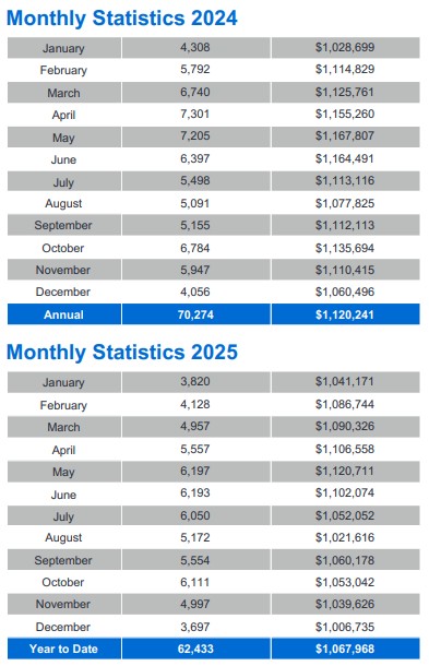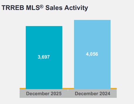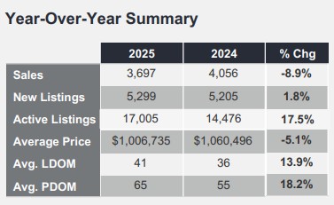 There were 3,697 home sales reported in December 2025 – down by 8.9 per cent compared to December 2024. New listings entered into the MLS® System amounted to 5,299 – up by 1.8 per cent year-over-year.