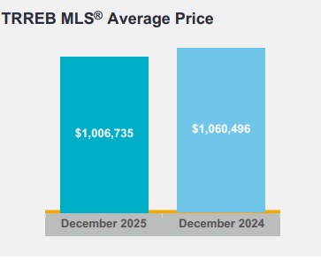 The MLS® Home Price Index (MLS® HPI) Composite benchmark was down by 6.3 per cent year-over-year in December 2025. The average selling price, at $1,006,735, was down by 5.1 per cent compared to December 2024. On a seasonally adjusted basis, December home sales were down slightly month-over-month compared to November 2025, while new listings were up. The MLS® HPI composite trended slightly lower compared to November while the average selling price edged higher.