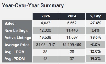 The MLS® Home Price Index Composite benchmark was down by 1.8 per cent year-over year in February 2025. The average selling price, at $1,084,547, was down by 2.2 per cent compared to the February 2024. On a month-over-month basis, the MLS® HPI Composite and the average selling price edged lower after seasonal adjustment.