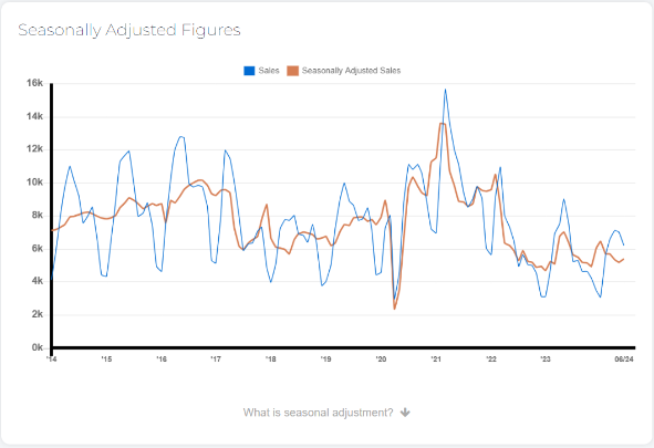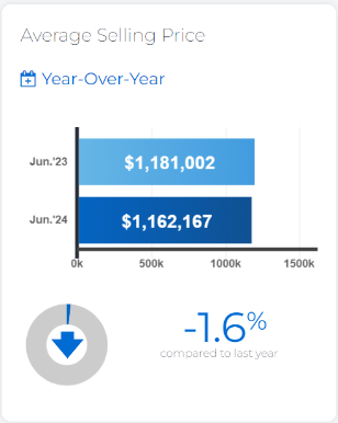 The MLS ® Home Price Index Composite benchmark was down by 4.6 per cent on a year-over-year basis in June 2024. The average selling price of $1,162,167 was down by 1.6 per cent over the June 2023 result of $1,181,002. On a seasonally adjusted monthly basis, both the MLS ® HPI Composite and the average selling price were up compared to May 2024.
