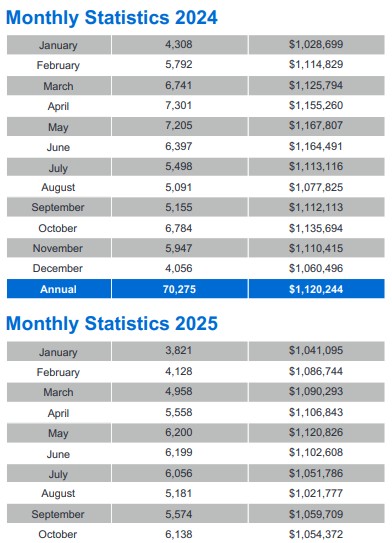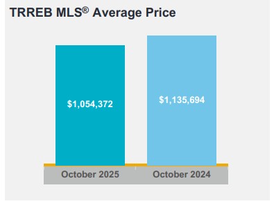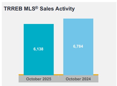 GTA REALTORS® reported 6,138 home sales through TRREB’s MLS® System in October 2025 – down by 9.5 per cent compared to October 2024. New listings entered into the MLS® System amounted to 16,069 – up by 2.7 per cent year-over-year.
