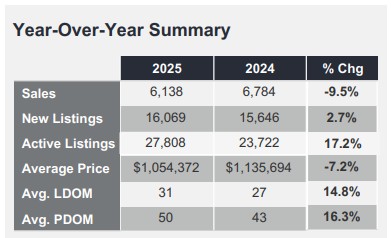 The MLS® Home Price Index (MLS® HPI) Composite benchmark was down by five per cent year-over-year in October 2025. The average selling price, at $1,054,372, was also down by 7.2 per cent compared to October 2024.