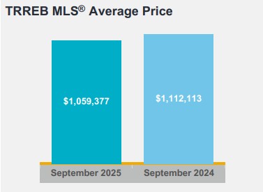 The MLS® Home Price Index (MLS® HPI) Composite benchmark was down by 5.5 per cent year-over-year in September 2025. The average selling price, at $1,059,377, was also down by 4.7 per cent compared to September 2024.